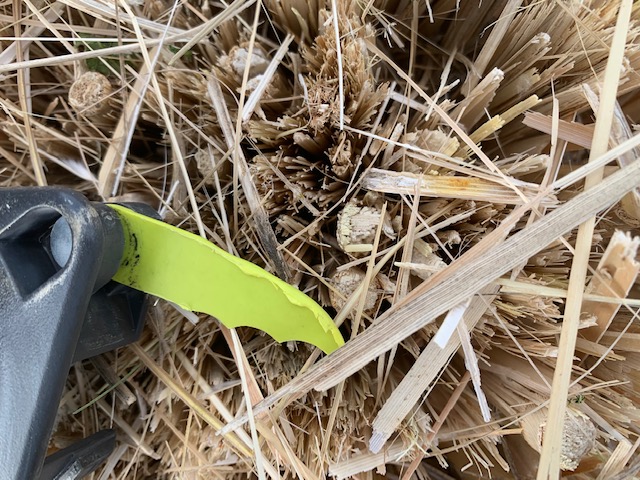 I tried to trim it back this last year with the hard-plastic blade attachment on my weed whacker. It destroyed the blade before I was half-way through. I actually resorted to a Sawzall to finish the job.