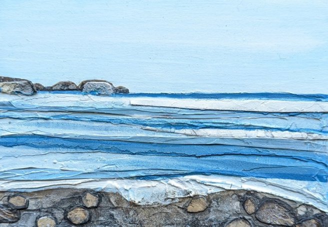 She takes that left over packing material, cloth fibers, even shreds of plastic bottles, mixes them with paint and substrate and creates amazing works of art.